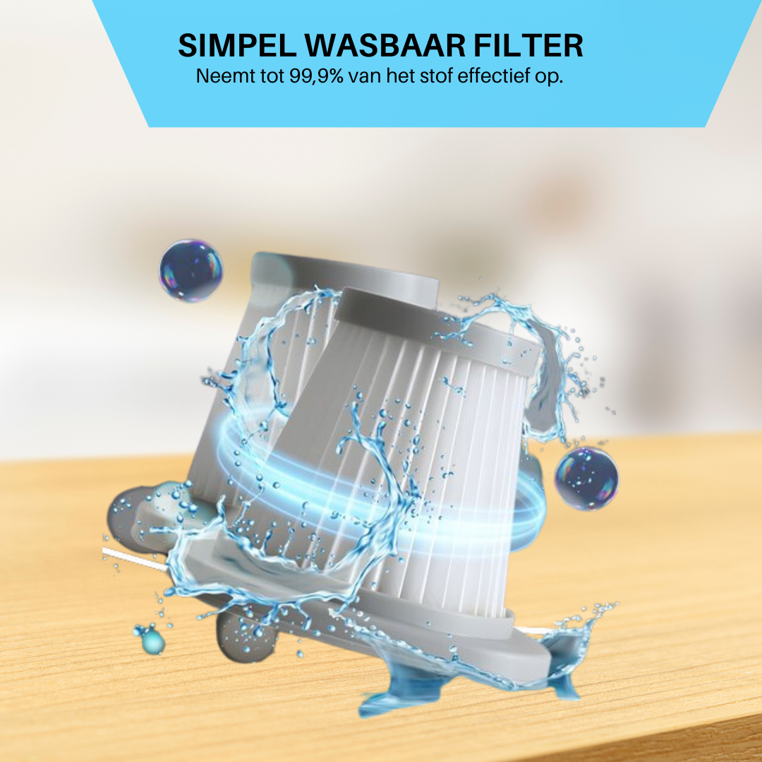 Het zakloze ontwerp en het wasbare HEPA-filter zorgen voor schone lucht tijdens het schoonmaken. Het filter is eenvoudig te reinigen, waardoor je telkens een hygiënisch resultaat krijgt.